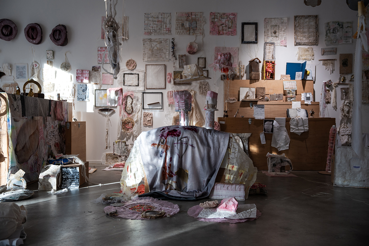 Afgelopen december verplaatste kunstenaar Ans Verdijk de volledige inhoud van haar atelier naar het Odapark. In de tuinzaal componeert ze een web van werken waar bezoekers doorheen mogen dwalen. De werken in deze ruimte zijn kwetsbaar, gemaakt van papier, textiel en gevonden materialen. Ze staan wankel op transportkisten of bungelen sierlijk vanaf het plafond.